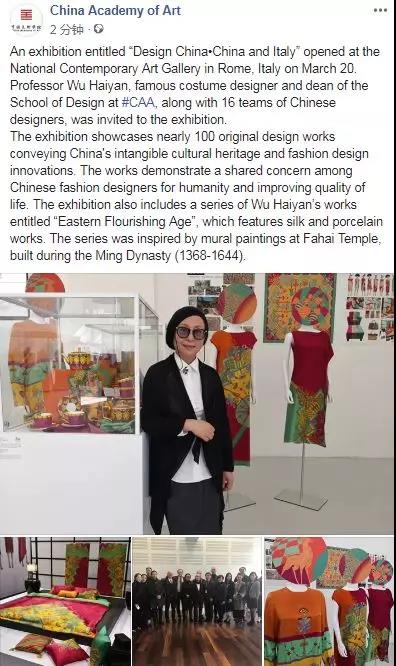 An exhibition entitled “Design China•China and Italy” opened at the National Contemporary Art Gallery in Rome, Italy on March 20. Professor Wu Haiyan, famous costume designer and dean of the School of Design at CAA, along with 16 teams of Chinese designers, was invited to the exhibition.